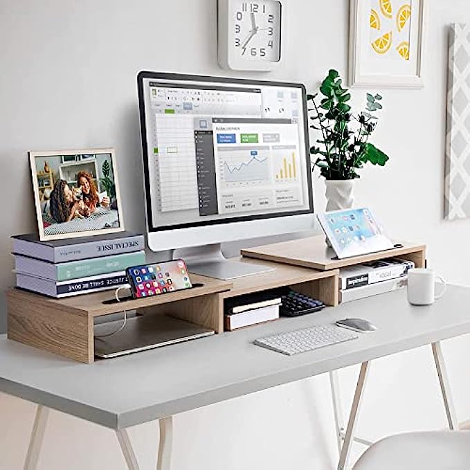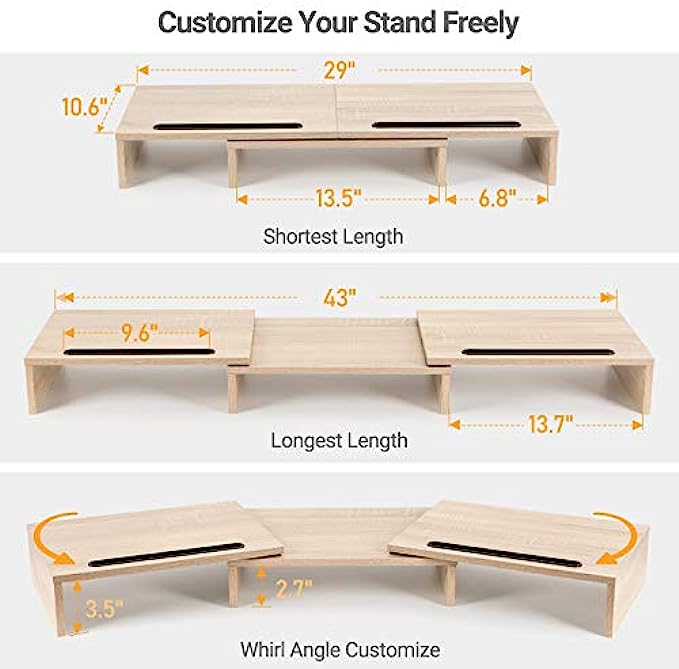 CUSTOMIZE YOUR STAND: Freely adjust the height and angle as you need. This dual monitor riser could help you to form a comfortable sitting position and gain a better viewing experience.