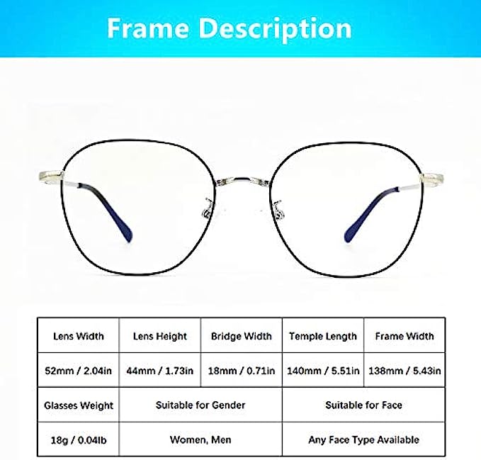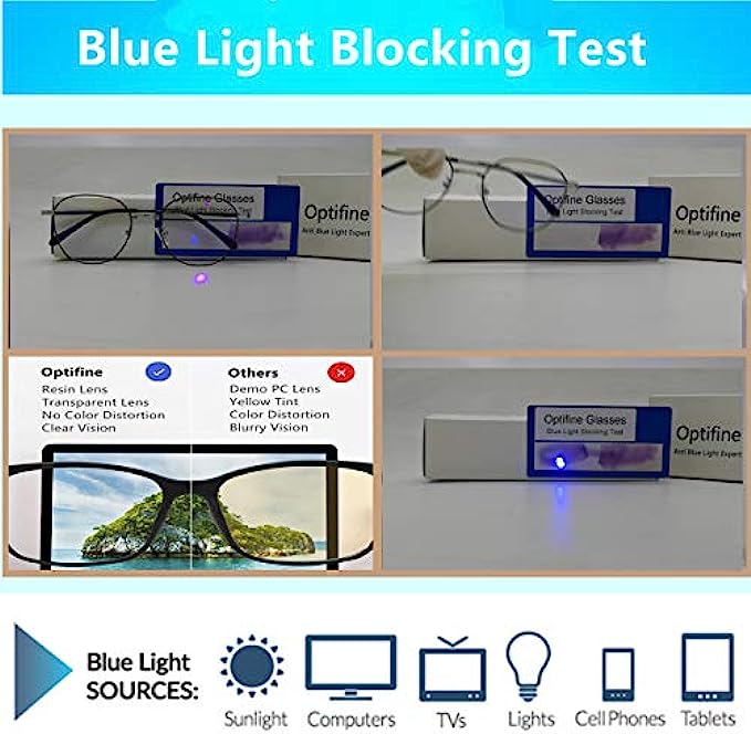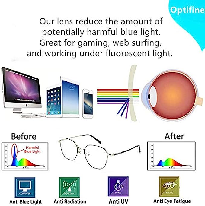 Stainless Steel frame blue light blocking resin lens lens Non Polarized Lens width: 52 millimeters ? ANTI BLUE LIGHT -- Staring at a computer screen all day can cause headache and nausea, Optifine Glasses will block 97% hurmful blue rays out, to minimize Digital Eye Strain caused by harmful blue light emitted from digital screens ? VERSATILE USE -- Designed for all-day wear. Optifine blue light blocking glasses are perfect for individuals who need to look at smartphone or computer monitors all day like office workers, tech engineers, and hardcore gamers ? ELEVATE ATTRACTIVENESS -- How you look is as important as how clearly you can see. Retro frame design keeps you looking professional and stylish while working or playing video gamess. Stand out from the crowd. The delicate construction of this frame looks great and ensures that they are comfortable throughout the day