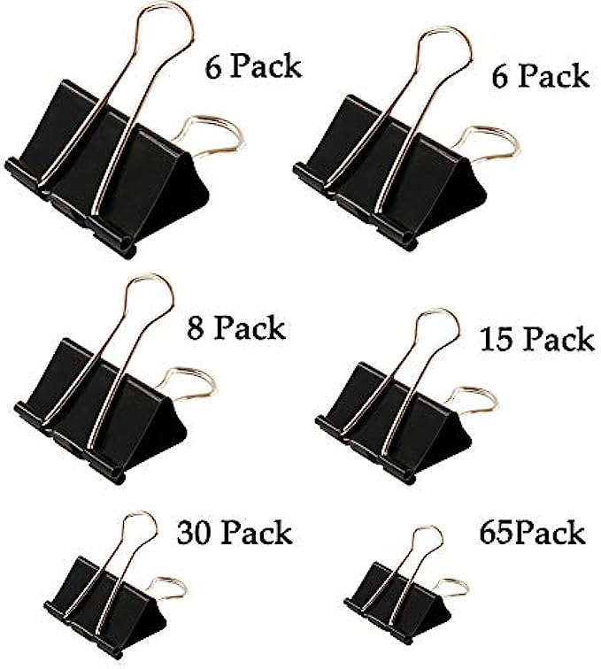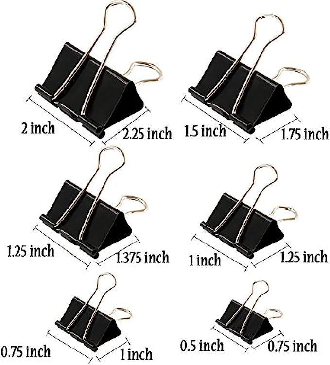 SIZE - 6 Sizes binder slips, 2 inches (6 pack) ,.1.5 inches (6 pack) 1.25 inches (8 pack) , 1 inch (15 pack), 0.75 inch (30pack),0.5 inch (65 pack) assorted size binder clips can meet your different using needs