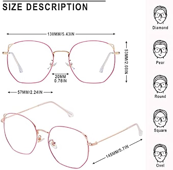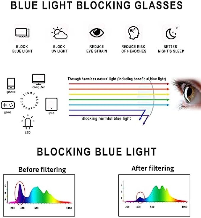 • ?【Provide long-term protection】Anti-blue light glasses can help you feel relaxed after a long day of work. When you wear this blue light filter, you can feel your eyes relax anytime, anywhere. Glasses can reduce visual fatigue and discomfort caused by long-term surfing, gaming and working under fluorescent lights, and have the effect of protecting and reducing glare.