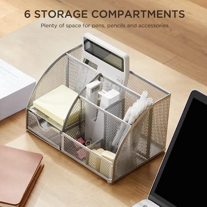 【LARGE CAPACITY DESKTOP ORGANIZER】FURNINXS desk organizer has 6 separate compartments and a sliding pull-out drawer, ideal desk storage for office supplies; suitable for small stationary supplies such as pens, pencils, markers, scissors, tape, notepads, lipsticks, makeup brushes