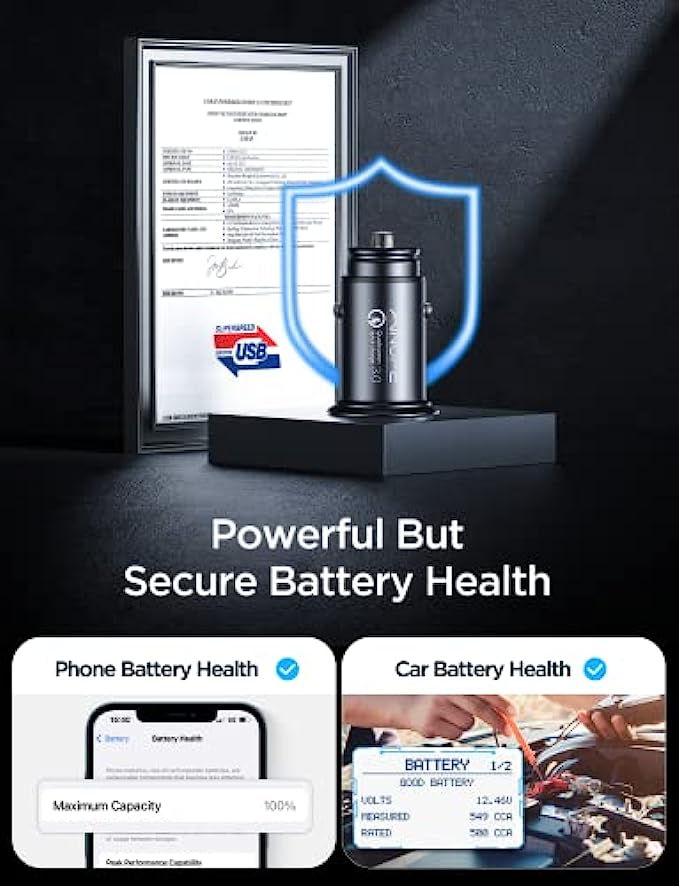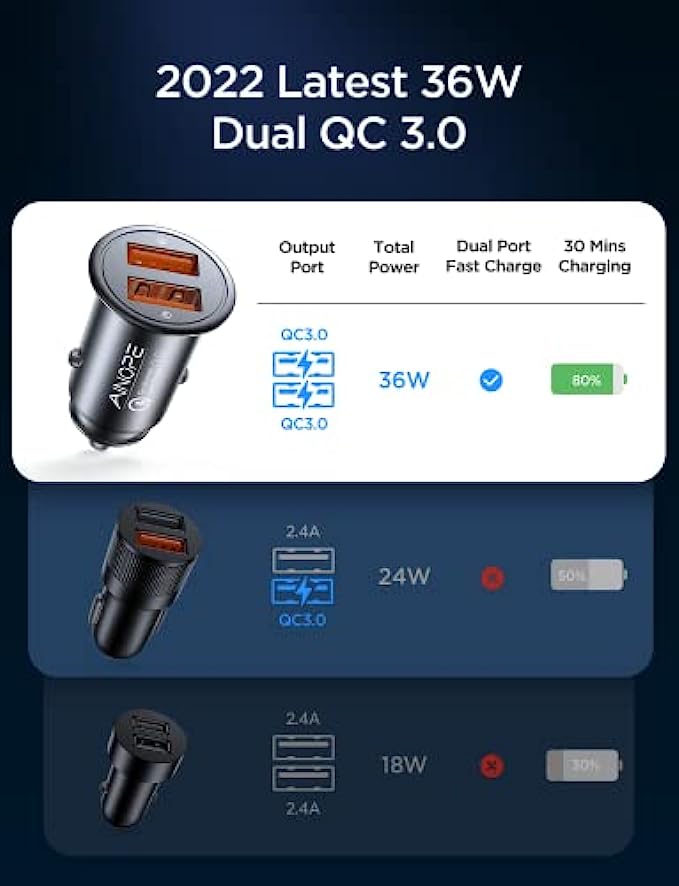 OFFICIAL CERTIFICATION BY QUALCOMM: AINOPE is honored to be a 1% partner of Qualcomm official certification. Additionally, in Qualcomm's approved military-grade laboratory, this QC fast car charger passed testing for fast charging speed, device compatibility, battery health and friendliness, and charging heat dissipation. AINOPE will provide the same quick charging experience as the original charger. OFFICIAL CERTIFICATION BY QUALCOMM: AINOPE is honored to be a 1% partner of Qualcomm official certification. Additionally, in Qualcomm's approved military-grade laboratory, this QC fast car charger passed testing for fast charging speed, device compatibility, battery health and friendliness, and charging heat dissipation. AINOPE will provide the same quick charging experience as the original charger. FULL METAL MINI BODY AND SAFETY CUARANTEE: With a tiny thumb-sized 1.79inch*0.94inch body, the upgraded metal mini USB cigarette charger is safer than plastic and will not burn out. The dual USB car charger features numerous precautions to escort the safety of your electronics by preventing over-current and overcharging through multiple safety certifications. Note:Although the all-metal body may give the impression that the metal case is more susceptible to heat, this is really one of the metal body's benefits in terms of heat dissipation and safety. UNIVERSAL COMPATIBILITY:This USB car charger charges for almost all electric devices,best iPhone car charger, also can charge for other all Android, iOS smartphones. Intelligent control shunt technology to charge your mobile device with maximum power FIRM AND UNINTERRUPTED POWER: The metal shrapnel at the bottom has undergone a strict plug-in test and can lock the cigarette lighter from being damaged. Additionally, the rapid car charger's snap-on shrapnel connections are more stable and elastic, allowing for continuous power transmission to the smartphone despite changing traffic conditions. SATISFIED AFTER-SALES SERVICE:Please get in touch with us if you have any issues with the car charger. Our reliable customer service will guarantee you the right solution online 24/7.