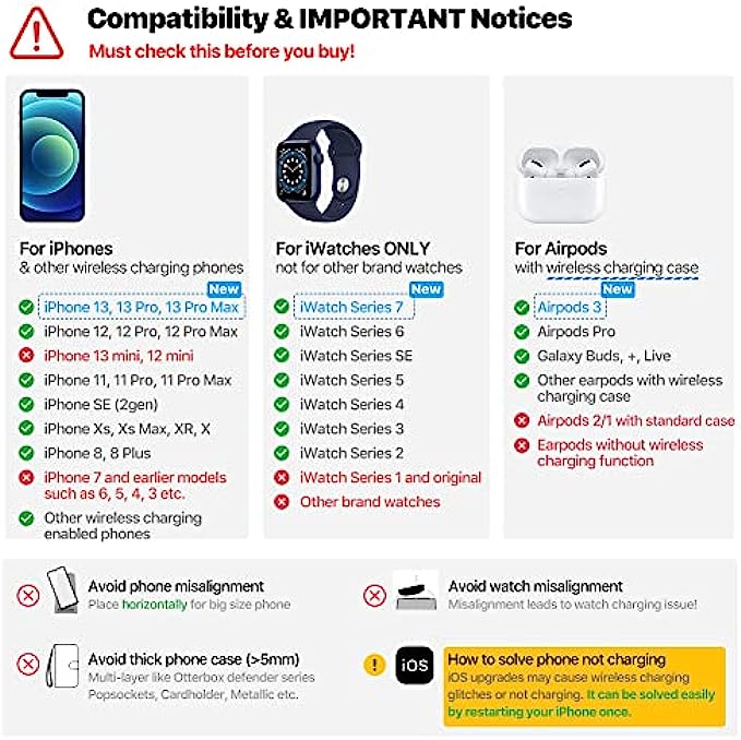【Universal Compatibility】 Qi standard, supports Apple iPhone 13/13 Pro/13 Pro Max (13 mini not supported)/12/12 Pro/12 Pro Max(12 mini not supported)/11/11 Pro/11 Pro Max/XS/XR/XS MAX/X/8/8Plus, iWatch 7/6/SE/5/4/3/2 (s1 not supported) and AirPods Pro/3 (or 2/1 with extra-purchased wireless charging case), and other 100+ popular Qi-Enabled Phones and wireless charging earpods.(Attention: ONLY supports earpods with wireless charging cases)
