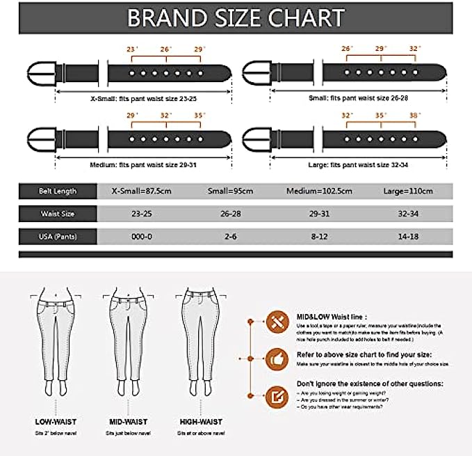• [ Belts Size ] Womens belt in XS/S/M/L size, belt wide 1 1/10", please measure your waistline(include the clothes you want to match)to make sure the item fits before buying (Our size chart is different from Amazon, please check it more careful)