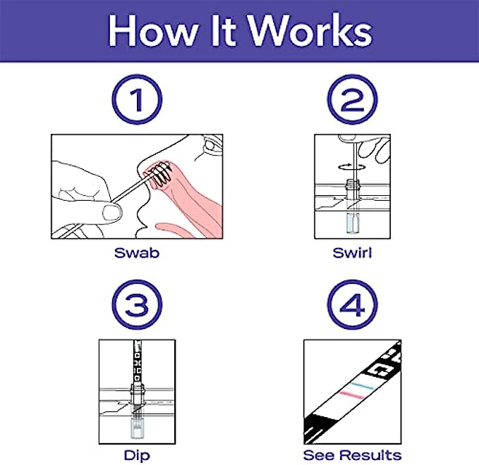 How To Use: 1. Swab - Collect a gentle nasal swab sample. 2. Swirl - After adding the swab to the solution tube. 3. Dip - Put the strip into the tube. 4. Read Results - Straightforward and easy-to-read results