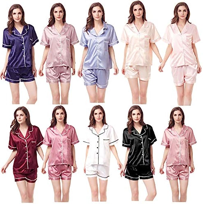 98% Polyester, 2% Other Fibers Button closure Hand Wash Only Material: Pajama set using premium 98% polyester, 2% spandex and plain matte satin material, feel very soft and silky, breathable, skin-friendly, so you have a restful sleep. Product Features: Loose fit, comfortable pajamas two-piece set Loose fit, comfortable two-piece pajama pajamas set with the silkiest elastic waist pants, elegant collar design, chest pockets, and flared buttons with contrast lace piping. The pajama set is soft and elegant, giving you a lazy sleep. Applicable Occasions: Women's short-sleeved silk satin pajama set, suitable for daily wear and easy to match. Light weight and easy to carry. Comfortable, suitable for rest and sleep, slumber party, girls' day, bridal pajamas, indoor, living room, bedroom, hotel, workplace, travel, daily pajamas. Cleaning instructions: The pajamas set is soft, not prevent the surface of the wrinkles affect the beauty, hand wash separately in cold water is recommended. Cool ironing on reverse side. Do not spin dry! Gift: Women's plain matte satin pajamas are made of high quality fabric with nice lace, soft and natural with luster. Perfect for your wife, girlfriend, mother, sister and daughter as a birthday gift, as well as for New Year, Valentine's Day, Christmas, bridal party gifts, honeymoon holidays or other holidays or anniversaries.