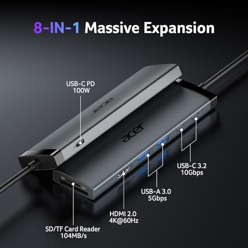 8 in 1 USB C Hub 10Gbps, USBC to HDMI Adapter 4K@60Hz, 2×USB-C 3.2, 2×USB A 3.0 Data Transfer, 100W PD Port Type C Multiport Splitter with SD/TF Card Reader, for Laptop, PC, Desktop, iPad Pro