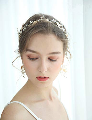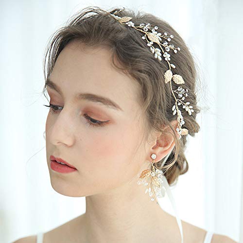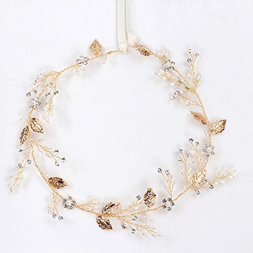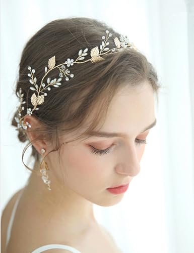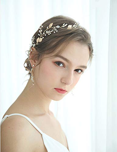 Aimimier Bridal Hair Vine Crystal and Pearl Headband Gold Leaf Headpiece for Bride Bridesmaid Handmade Hair Accessories for Women