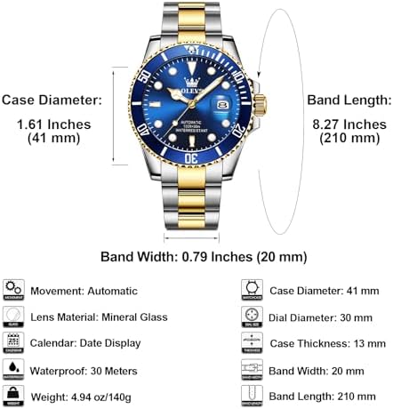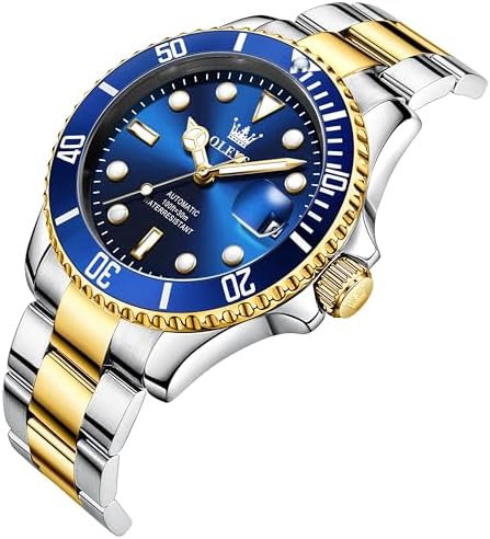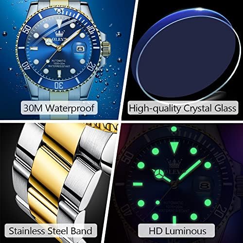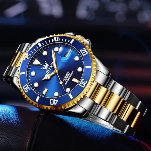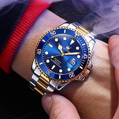 Men's Automatic Watch, Large Face Easy to Read Stainless Steel Self Winding Dress Watch, Casual Rotating Bezel Luminous Hands Date Waterproof Mens Wristwatch, Blue/Green/Black Dial
