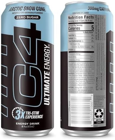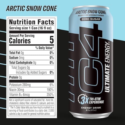 C4 Ultimate Sugar Free Energy Drink 16oz (Pack of 12) | Arctic Snow Cone | Pre Workout Performance Drink with No Artificial Colors or Dyes