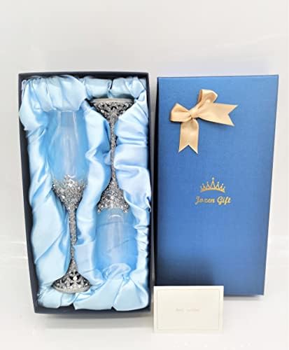 Champagne Flutes - Crystal Glass Metal Base With Crystal Stones, Set of 2 Toasting Flute Pair, Wedding Anniversary Party Birthday Banquets and Gifts for Bride and Groom(Silver)