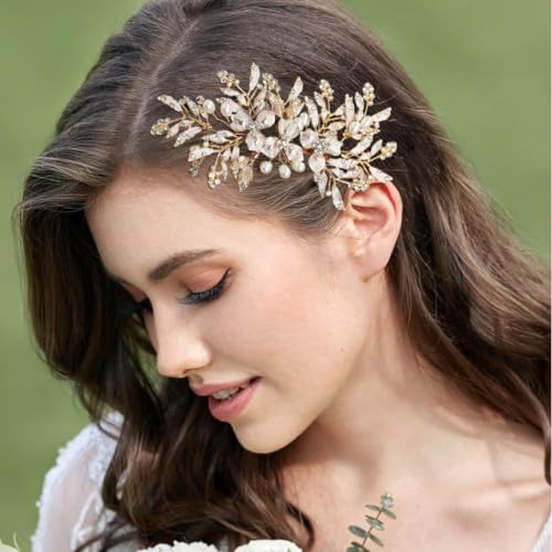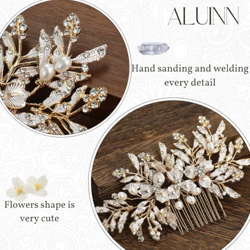 ALUINN Crystal Bride Wedding Hair Comb Pearl Hair Piece Rhinestone Bridal Hair Accessories for Brides Bridesmaids Women (Gold)