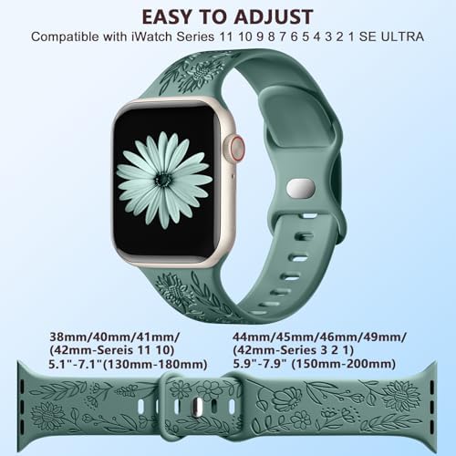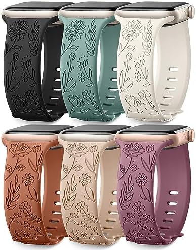 6 Pack Floral Engraved Bands Compatible with Apple Watch Bands 40mm 41mm 42mm 38mm 44mm 45mm 46mm 49mm Women Men, Silicone Flower Pattern Strap for iWatch Series 11 10 Se Ultra 9 8 7 6 5 4 3 2 1