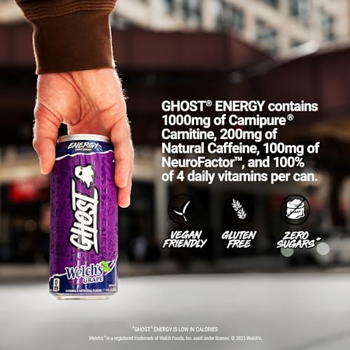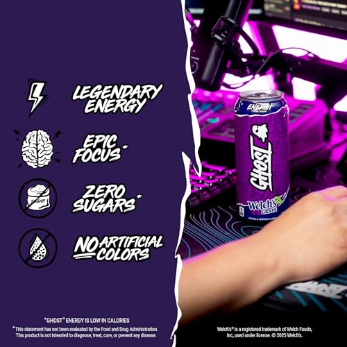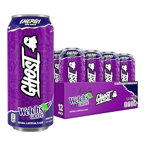 GHOST Energy Drink - 12-Pack, Welch's Grape, 16oz Cans - Energy & Focus & No Artificial Colors - 200mg of Natural Caffeine, L-Carnitine & Taurine - Gluten-Free & Vegan