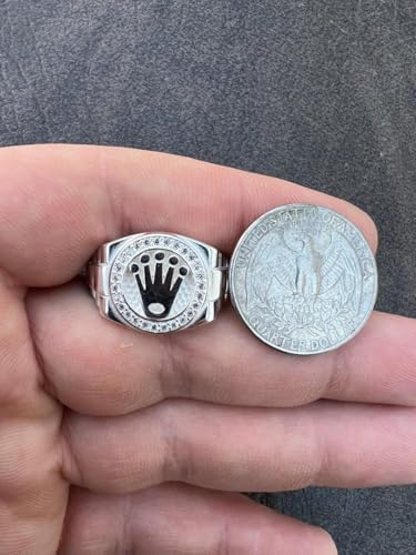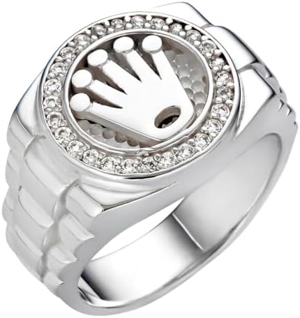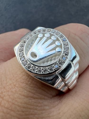 Rolex Crown Ring for Men – Solid 925 Sterling Silver – Iced Out with 0.3ct CZ Stones – Hip Hop Statement Ring – Luxury Jewelry Inspired by Rollie Watch Style – 15mm Face – Heavy 8-9g Ring