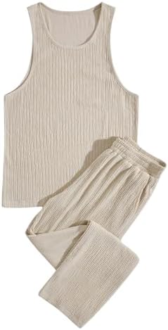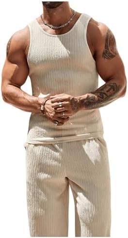Men's 2 Piece Linen Sets Rib Knit Summer Outfits Sleeveless Tank Top Baggy Wide Leg Pants Set