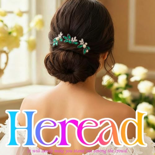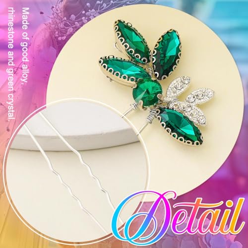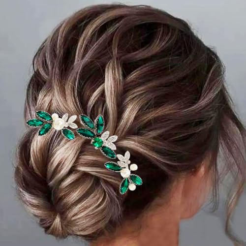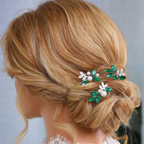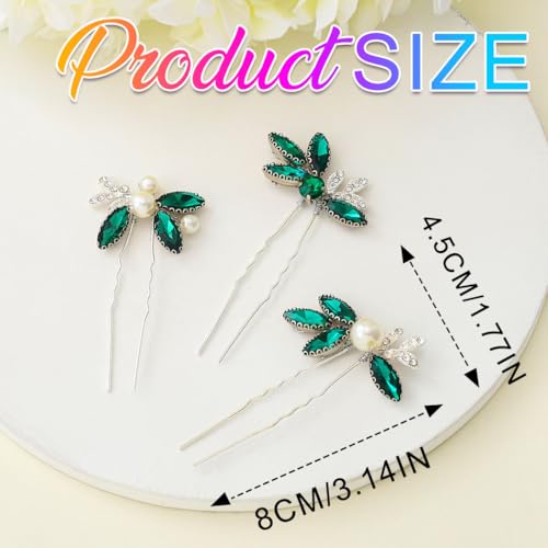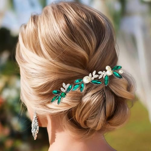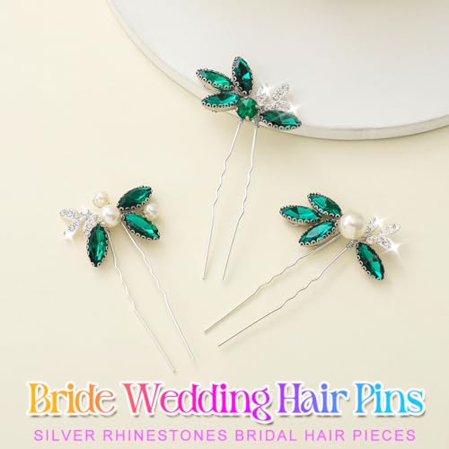 Heread Green Crystal Bride Wedding Hair Pins Silver Pearl Bridal Hair Pieces Rhinestones Leaf Hair Accessories for Women and Girls (Pack of 3)