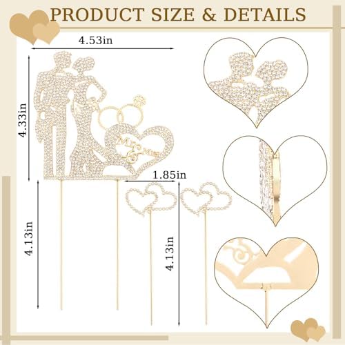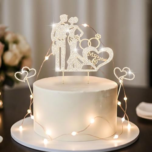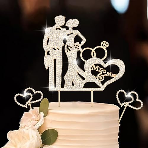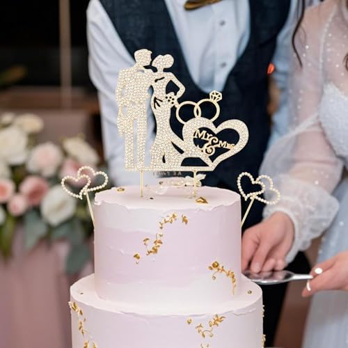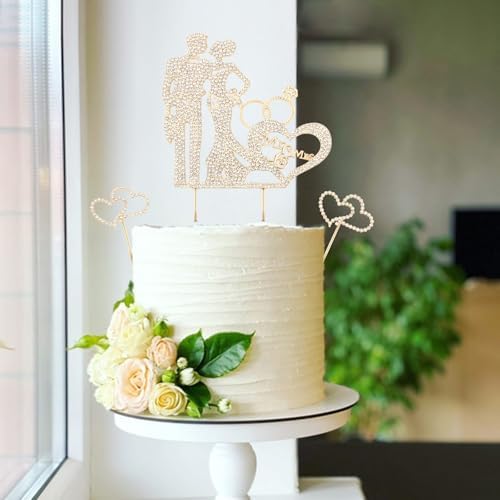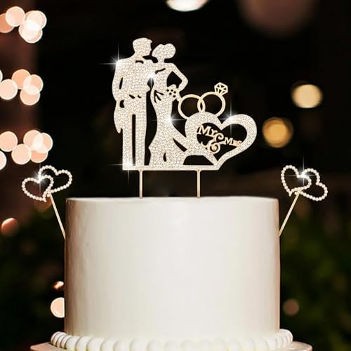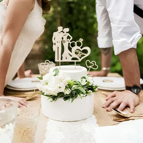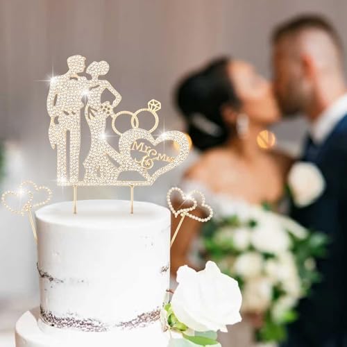 3PCS Crystal Bride and Groom Wedding Cake Topper Mr & Mrs Just Married Wedding Decorations Based Gold Alloy with White Rhinestones 2mm Thick