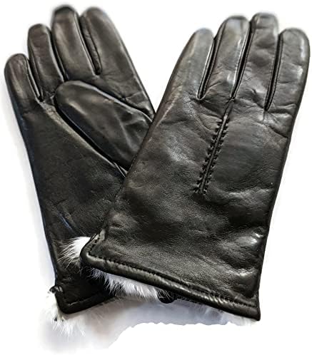 Ladies Rabbit Fur Lined Genuine Leather Gloves, Medium Black