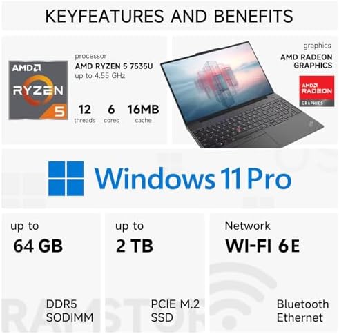 ThinkPad E16 Gen 2, 16" FHD+ Touchscreen Business Laptop, AMD Ryzen 5 7535U, 32GB DDR5 RAM, 1TB SSD, Fingerprint, Backlit Keyboard, Webcam, Wi-Fi 6E, HDMI, Windows 11 Pro, Black, w/Bundle