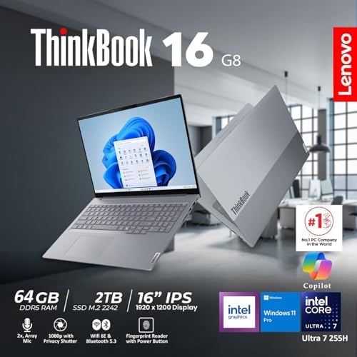 ThinkBook 16 Gen 8 Business Laptop Computer, Intel 16-Core Ultra 7 255H (Beat i7-13900H), 64GB DDR5 RAM, 2TB PCIe SSD, 16" FHD+ AI PC, WiFi 6E, Bluetooth 5.3, Fingerprint Reader, Windows 11 Pro
