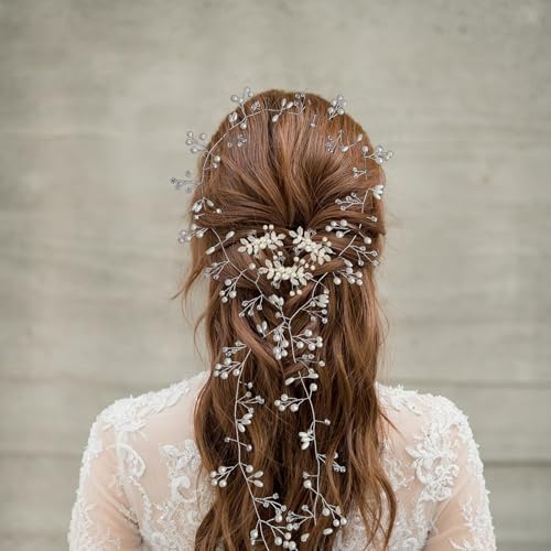 Bride Wedding Crystal Hair Vine Accessories Extra Long Pearl and Beads Bridal Headband Head Pieces for Women Girls (Silver)