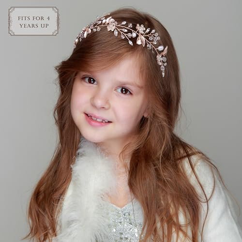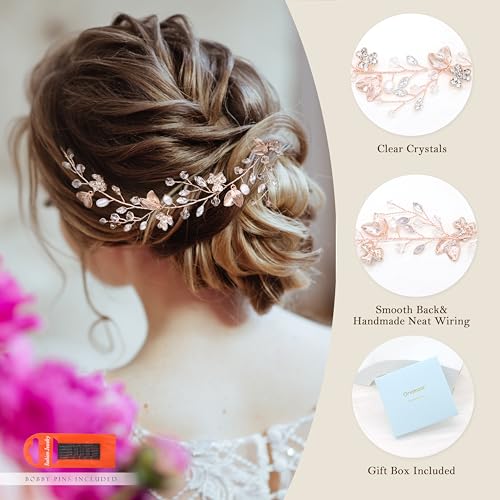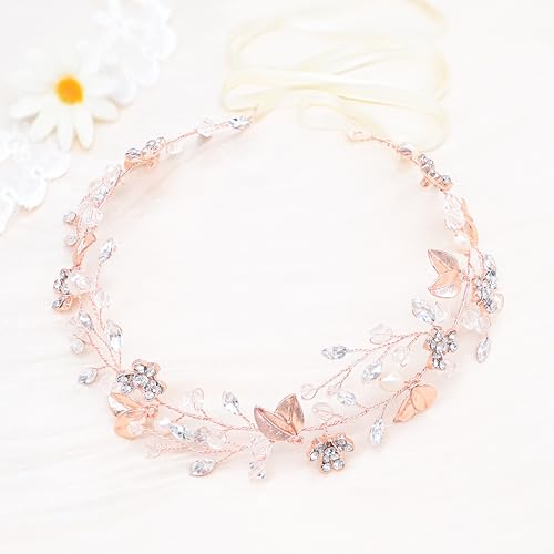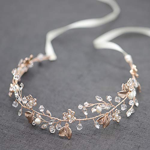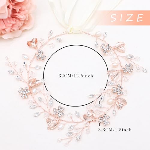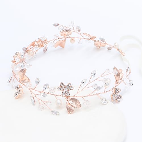 Oriamour Bridal Headpiece Wedding Crystal Headband With Leaves and Freshwater Pearl Hair Accessories For Bride Flower Girl (Rose Gold)
