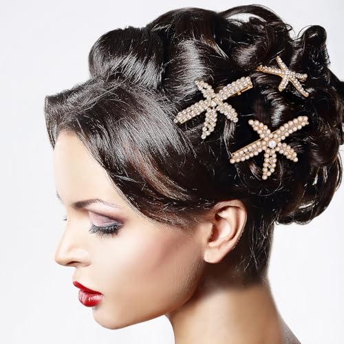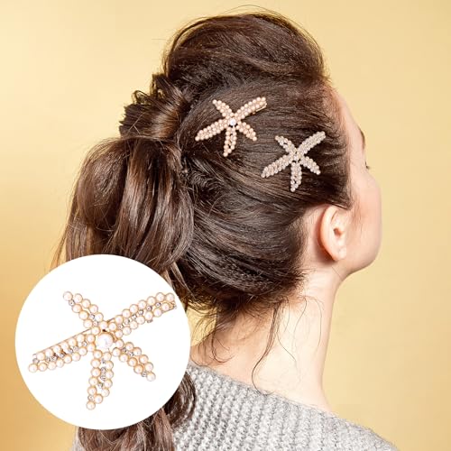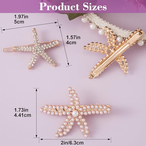 PAGOW 3 PCS Starfish Hair Clips, Gold Pearls Rhinestone Hair Clips, Crystal Sea Star Ponytail Holder, Faux Pearl Crystal Wedding Headpiece Hair Accessories for Women, Bride (3 Styles)
