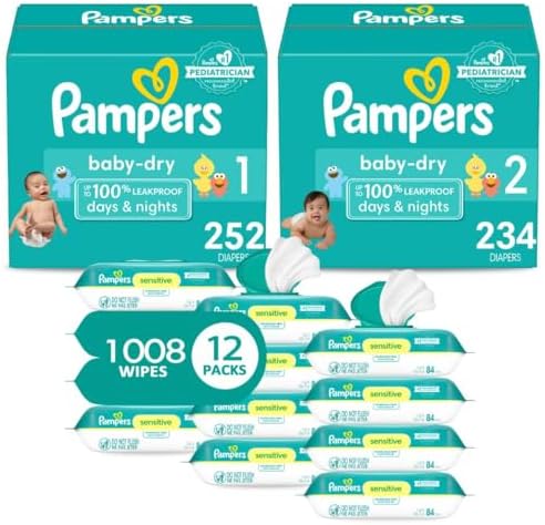 Baby Dry Disposable Baby Diapers Starter Kit, Sizes 1 (252 Count) & 2 (234 Count), with Sensitive Water Based Baby Wipes 12 Flip-Top Packs (1008 Wipes Total)