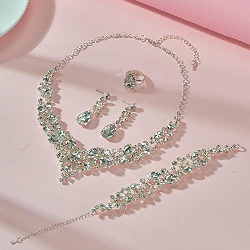 Crystal Bridal Wedding Jewelry Sets for Women Rhinestone Teardrop Crystal Statement Choker Necklace Drop Earrings Link Bracelets Rings Teardrop Jewelry Set for Brides Bridesmaids