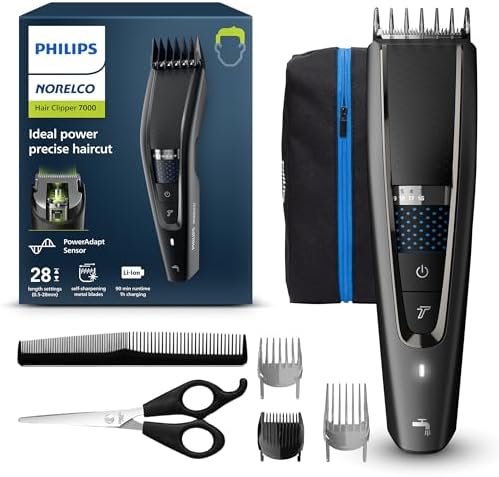 Philips Hair Clipper 7000 Series, Hair and Beard Trimmer, Precision Dial, PowerAdapt Sensor, Trim-and-Flow, DualCut, DuraPower, 28 Length Settings, 90 Min. Runtime, HC7650/40