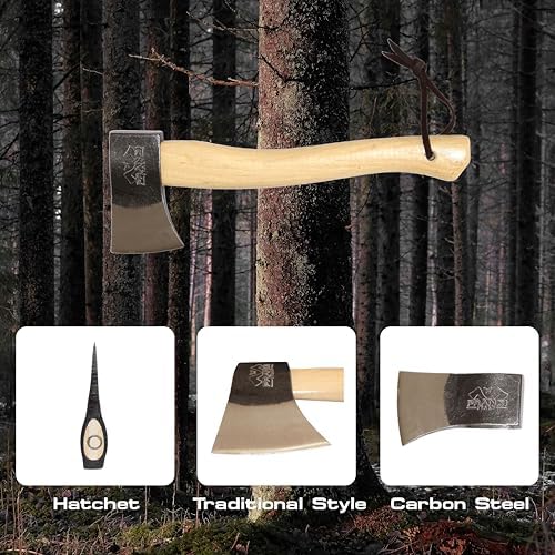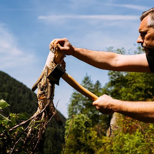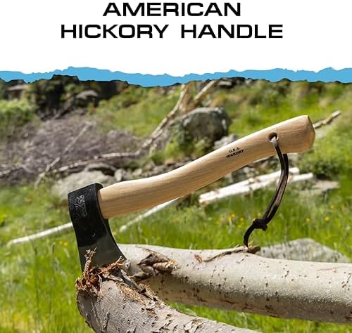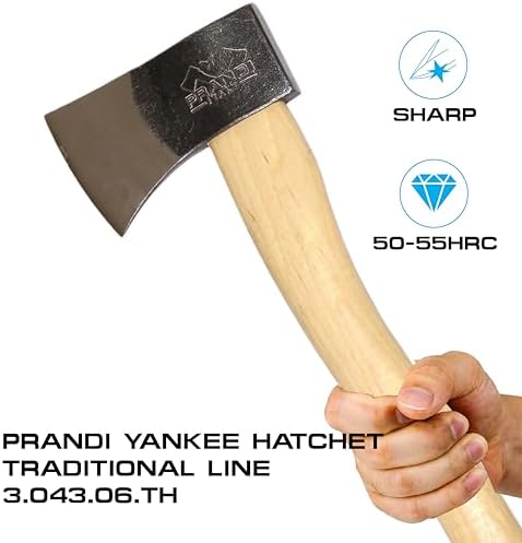 Prandi Axes Yankee C45 Forged Carbon Steel Hatchet - Hickory Handle with Leather String - Ideal for Camping, Travel and Bushcraft - S/N 3.043.06.TH - 15" L x 5.3" 1W, 600g Polished Head, No Sheath