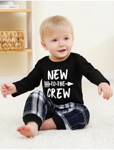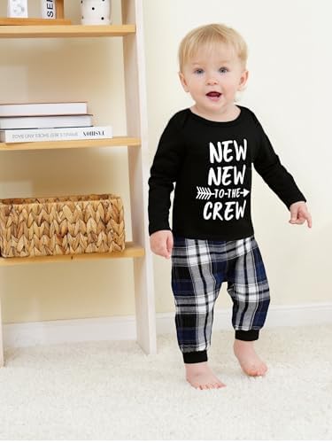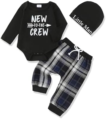 Newborn Baby Boy Fall Clothes, Long Sleeve Letter Printed Rompers Plaid Pants Hat Outfits Clothing Set 0-18 Months