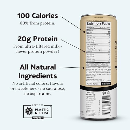 Slate Milk - High Protein Iced Coffee - Vanilla Latte - 175mg Caffeine, Lactose Free Energy - 20g Protein, 1g Sugar, 100 Calories, 1g Net Carbs, No Sugar Added - Protein Coffee - 11 fl oz, 12 Cans