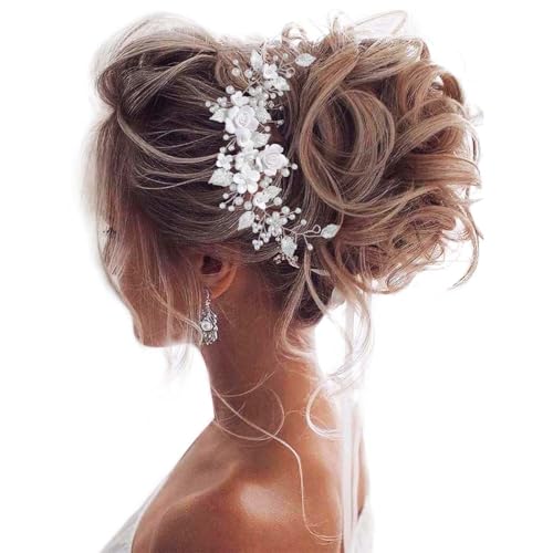 Unicra Flower Bride Wedding Hair Vine Pearl Bridal Hair Piece Leaf Hair Accessories Rhinestone Headband for Women and Girls (9inches) (Silver)