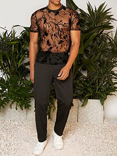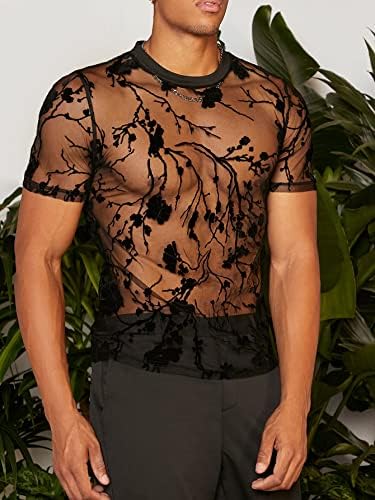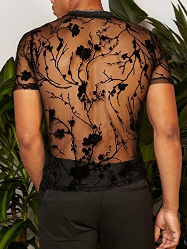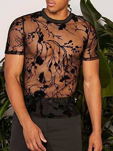 Men's Floral Print See Through Round Neck Short Sleeve Mesh Tshirt Party Top