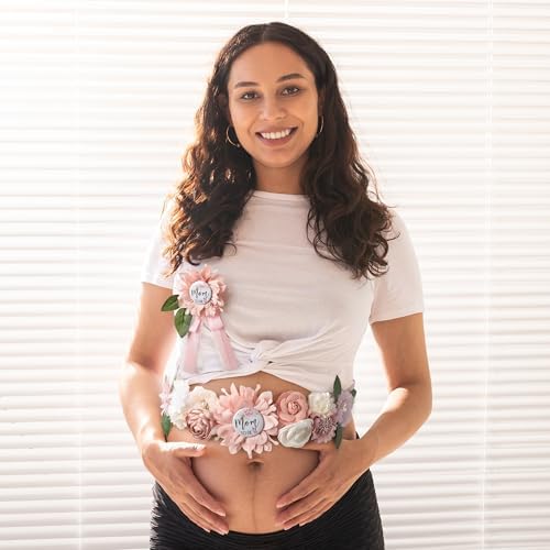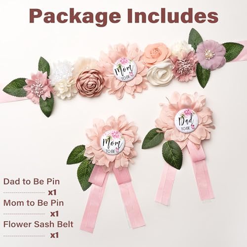 Baby Shower Maternity Sash Belly Belt-Pink Flower Sash Set Mom to Be & Dad to Be Corsage Pins for Gender Reveal