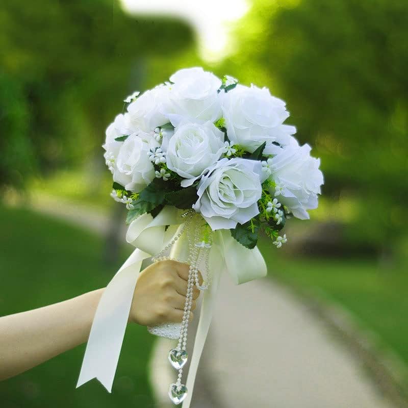Wowagoga 12 Inch Wedding Bouquet with Pearl Crystals Ribbons,Artificial Rose Flower for Bride Bridesmaids Artificial Fake Flowers Fake Flowers Toss Bouquet for Wedding Party Church(White)