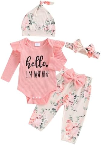 Hello World Newborn Outfit Baby Girl Going Home Outfit Ruffle Ribbed Romper Top Floral Pants Set Cute Summer Clothes
