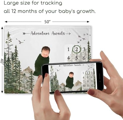 Yuzioey Adventure Awaits Milestone Blanket, Forest Mountain Baby Growth Chart Monthly Blanket, Watch Me Grow Woodland Mountain Tree Baby Nursery Shower(50"x40")